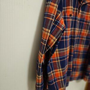Red, blue, plaid long sleeve shirt flannel pointed collar buttons down front and sleeves 2 pockets with buttons Machine Washable cold water 100 % Cotton arm pit to pit 26 inches length 29