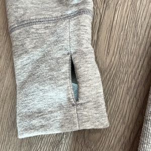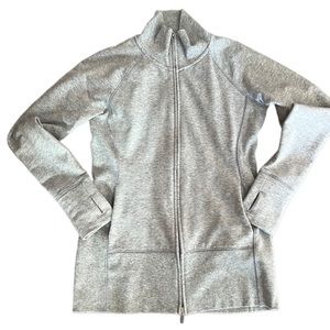 Nice and fitted; medium weight. 1 owner. Hardly worn and clean. Zipper can go down from the top or up from the bottom. the long sleeves can go beyond the wrist and the thumb hole keeps it in place. Cotton blend. Nice mock neck to keep warm. 2 pockets outside and 2 inside. Long to drape past hips a bit. Primary photo is virtual.