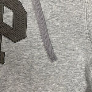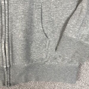 Soft and comfy with bold gray on gray lettering. Full zip with front pockets. Tags are washed out and illegible. Slight fading noted at elbows and small spot noted near one cuff.