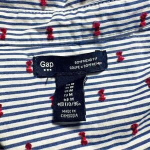 Gap boyfriend fit, women’s button-down shirt with blue stripes and tiny pink bows. Size M.