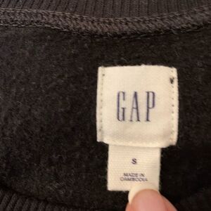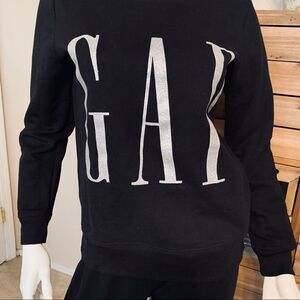 This black GAP sweatshirt is preowned in very good condition has two slits at the waist. The word GAP is all glittery in silver