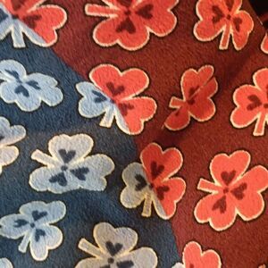 The clover on this dress has an almost 3-d effect. Border print changes from red to blue. Side zip. Ties at neck. Lined skirt. Long sleeves with button cuffs. Size 4 measures 34 at chest, 27 at waist. 44 at hips, pockets here. 35.5 long from shoulder to hem. A great look for a beautiful day.
