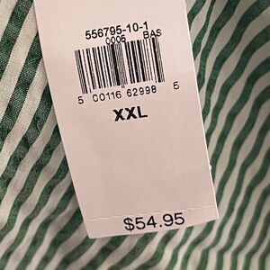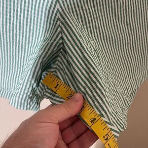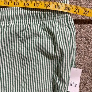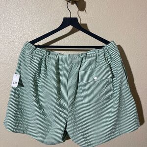 Stylish swim board shorts. Green and white stripes. Comfortable fit. Perfect for beach or pool.