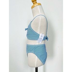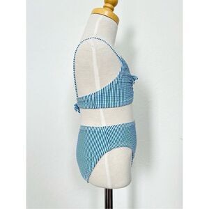 Adorable retro styled 2-piece swim suit in seersucker stripe. 85% nylon, 15% Lycra, lining is 100% polyester. New with tags.