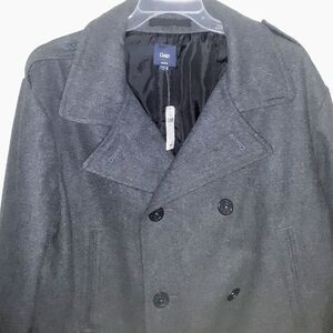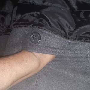 Grey color, warm, and comfy trench coat. Button closing detail. Has no real pockets on the outside, but it has one big pocket on the inside as pictured. It's new with tags. Has one small area in the back that feels like maybe some glue got in there. Not really noticeable. Please see last picture for reference.