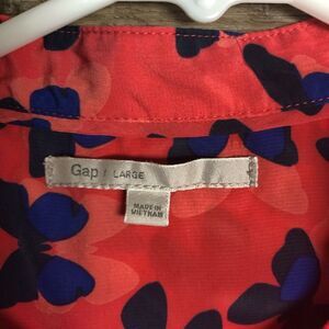 Vibrant peach/orange blouse with bold blue butterfly patterns. Ideal for casual wear.