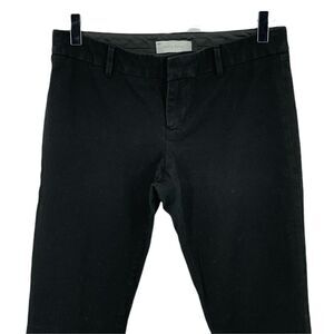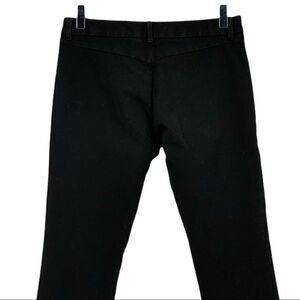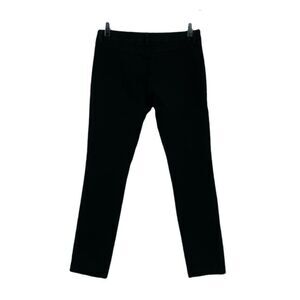 Tailored black dress pants feature a super stretchy material in a sleek silhouette. Zipper fly with 2 hook closure outside and 1 inner button. Zipper slides easily. Belt loops around waist. Back yoke. No pockets. No rips, holes, pilling, stains, or discoloration. Very versatile, as it is nice enough for work but comfortable enough for casual wear. Discontinued style. Smoke-free and pet-free home.