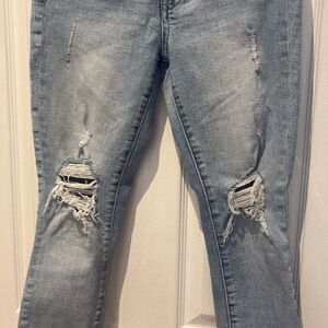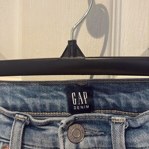 These GAP skinny jeans feature a trendy distressed design with visible rips on the knees, offering a casual and stylish look. The high-rise waist and vintage-inspired blue color add a touch of classic charm, making them a versatile addition to any wardrobe.