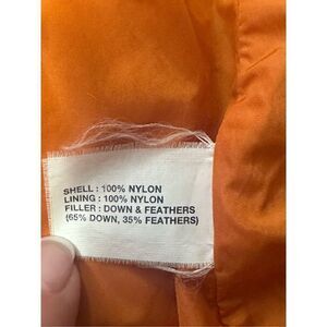 Super fun GAP quilted down puffer jacket in size small. Super warm and flattering. Removable and adjustable hood. Cuffed inner sleeve to keep cold and snow out. Cute square quilted pattern. Silver hardware. 2 outer zip pockets and 1 inner fleece lined pocket. Contrasting orange lining. High collar for warmth. No reason you can’t look cute while staying warm. Great for a valentines outing. Has some very light gray markings around cuffs from use. Practically unnoticeable. Pay close attention to photos. Great to EUC!