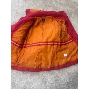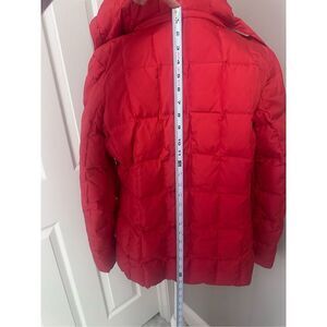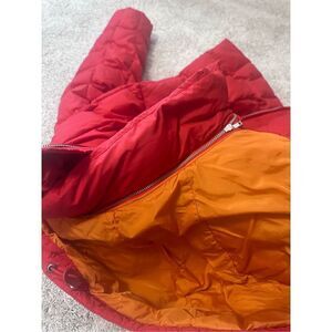 Super fun GAP quilted down puffer jacket in size small. Super warm and flattering. Removable and adjustable hood. Cuffed inner sleeve to keep cold and snow out. Cute square quilted pattern. Silver hardware. 2 outer zip pockets and 1 inner fleece lined pocket. Contrasting orange lining. High collar for warmth. No reason you can’t look cute while staying warm. Great for a valentines outing. Has some very light gray markings around cuffs from use. Practically unnoticeable. Pay close attention to photos. Great to EUC!