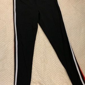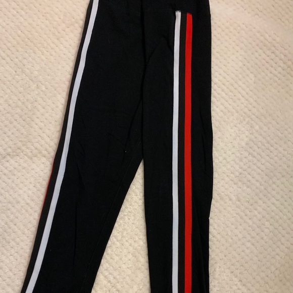 Light and Comfortable Garage sweatpants. The bottom of the sweats are open leg. The colors are Blue, Red, and white.