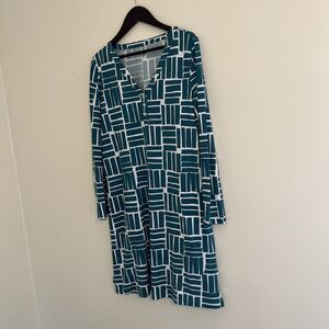 GARNET HILL Organic-Cotton Knit Henley Gown, Teal Geometric- XS