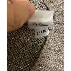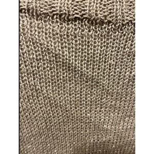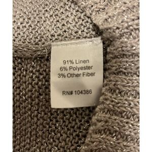 Slightly sheer knit. S. Color is a taupe gold with hints of shimmer. There is a minor pull. Can probably be just pushed back through. Very flattering. Linen blend.