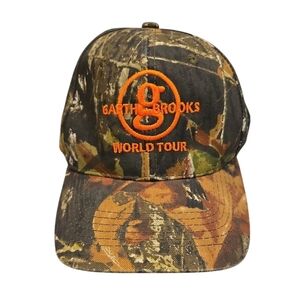 Camouflage cap with orange Garth Brooks World Tour embroidery. Perfect for fans and outdoor enthusiasts.