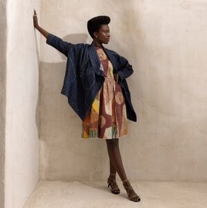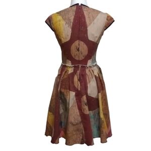 This is a heavier, dense material dress that zips up in the back with a small hook enclosure. The earthy colors have a unique wood-grain design and controlled fray around the waist, along the hemline, and along the bottom of the sleeves.