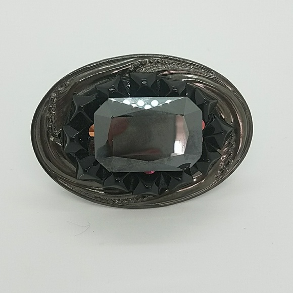 GASOLINE GLAMOUR DELUXE RING HUGE SWAROVSKI JET HEMATITE RECTANGLE FANCY STONE FAUX ONYX STUDS SWAROVSKI VOLCANO RHINESTONES GUN METAL OVAL SETTING ADJUSTABLE RING SHANK ONE OF A KIND FROM THE VAULT MAKE ME AN OFFER I CAN'T REFUSE BUNDLE YES TRADE NO *****SEVERE chipping on rectangle see pix