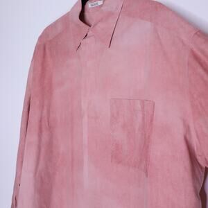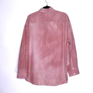 A slightly oversized, cloudy dusky rose, long-sleeved shirt with a hidden button-up front. Standard collar, large left chest pocket. Wide pearlescent button cuffs, and a rounded hem with slits.