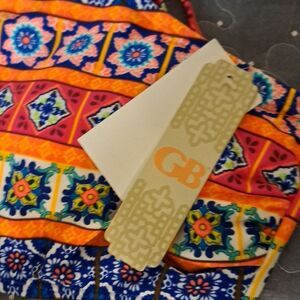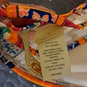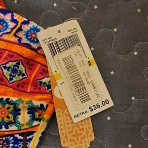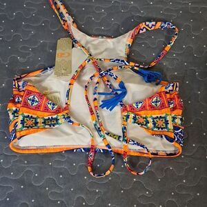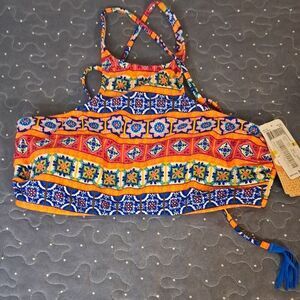 Vibrant swim top with geometric patterns. Features a mix of blue, orange, and red colors.