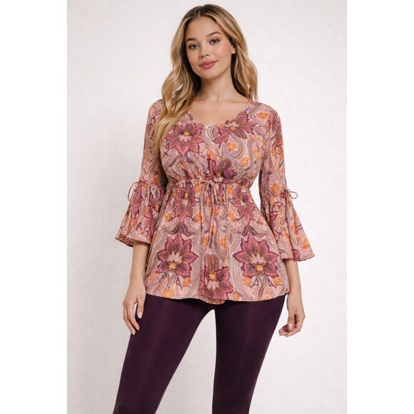 Beautiful boho-inspired womens peplum tunic top featuring an allover floral print in warm autumn tones of orange, mauve, rust, and plum. This flattering V-neck blouse has a cinched empire waist that flows into a relaxed peplum silhouette, making it comfortable and figure-friendly. The long bell sleeves include adjustable tie details for added bohemian charm. Lightweight and airy, perfect for layering in fall or wearing year-round. Great paired with leggings, denim, or boots for a casual boho look. Please refer to measurements for best fit.