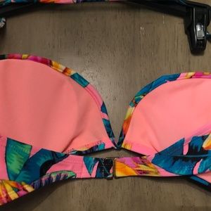 GB Pink Floral Tropical Multi colored Large Bikini. Bought from Dillards. The top had an underwire from the v to under the breast , lined with a removable strap that goes around the neck.The matching bottoms has a band around the top with good coverage. Worn a few things over one season. No flaws, good fit and great colors.