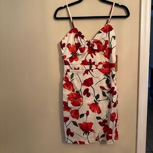 Stylish mini dress with bold red floral design. Features delicate spaghetti straps.