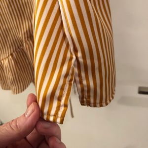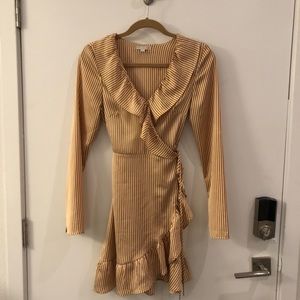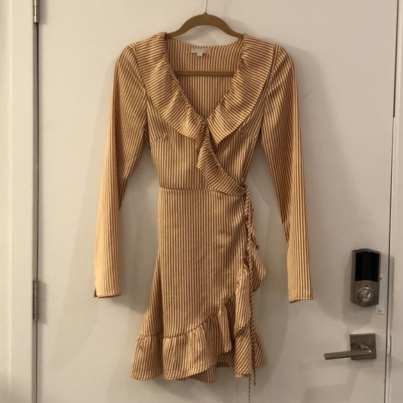 GORGEOUS and super flattering Gianni Bini wrap dress with ruffles. Non Smoker home. Worn one time. It’s a mustard yellow gold and cream stripes.