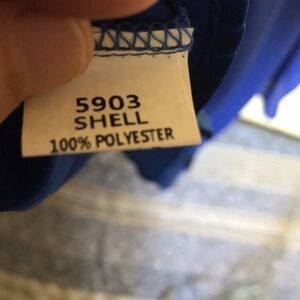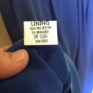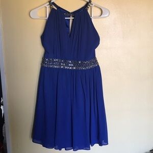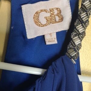 Like new excellent condition Blue GB formal knee length with halter beaded straps and around waist. Has an peek-a-boo back with a button closure at neck. 95% polyester 5% spandex