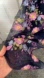 GB formal gown in navy with embroidered pink, yellow, and blue flowers.