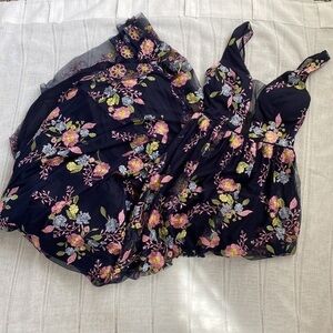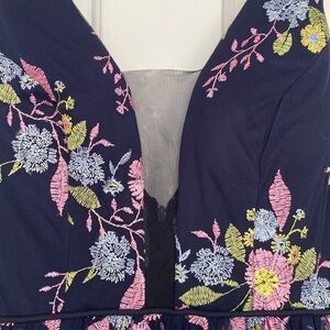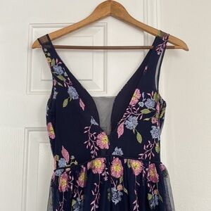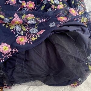 GB formal gown in navy with embroidered pink, yellow, and blue flowers.Stunning sweetheart neckline. Size 3. Sheer navy overlay with embroidered flowers. Lined with tulle in the skirt for a full ball gown look. Mesh on bodice for a glamorous look and the top is lined with breast cups. Only worn once! No tears, rips, or other imperfections.