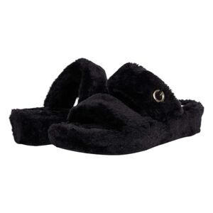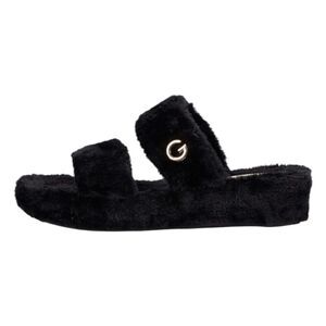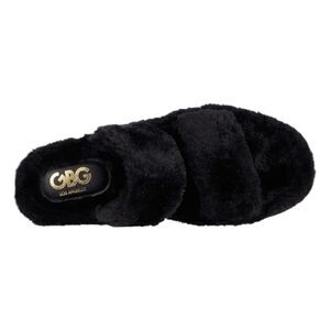 GBG Los Angeles Lennly Casual Furry Slippers in Black Faux Fur hug of cozieness. This is the perfect casual slipper to wear at home. It features a Gold G logo ornament detail. GBG Los Angeles, an extension of GUESS? Inc.