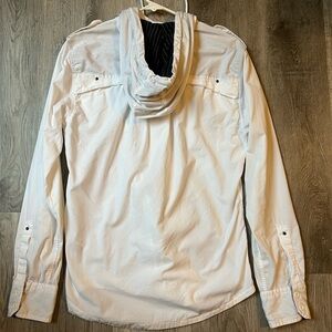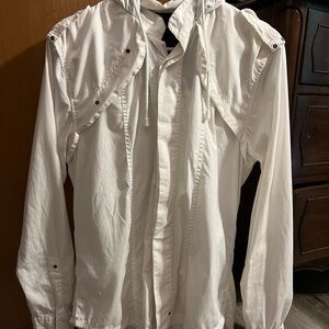 G by Guess early 2000’s mens sleek white button up with drawstring hood& half collar. Inner cuffs and hood reveal black pinstriped lining; hidden breast pocket, shoulder epaulettes, aesthetically positioned black rivets throughout. Handsome 00’s piece with very little wear. Mens size M, although in my opinion fits a little closer to a men’s S so please be aware of that. Front length shoulder-bottom hem aprox 27”. Can be worn by itself or over another shirt. This is a lightweight buttonup, more of a mock breaker than an actual jacket. Impossible not to look handsome in! Such a nice and unique shirt, really hate to let it go but unfortunately it no longer fits me.