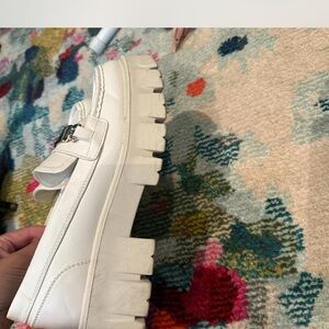 Chic white loafers with sleek silver detailing. Perfect blend of style and comfort.