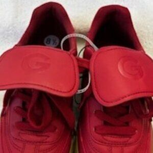 GBG Los Angeles (G by Guess) red athletic sneakers with matching red laces that are secured under the logo "G" tongue. The tongue has a velcro tab that secures the tongue over the laces. These faux leather sneakers have a cushioned insole and cushioning around the heel and the logo "G" button on the back of each heel on the outside. The outsole is manmade and textured with the logo "G" (pictured). So practical while being fashionable and sure to enhance any outfit. NWOT Never been worn/no box.