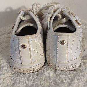 These white quilted faux leather G by Guess women's sneakers are a size 7M. They have leather soles and cushioned insoles for comfort. In great condition. All offers are welcome.