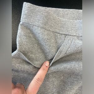 Mid-weight grey knit high rise wide leg pull in pants made of a fiber blend including wool, cashmere, & silk. elevated loungewear, perfect for your airport fit or other comfy meets cool occasion. On trend wide leg. Faux pockets. Light gusset pilling, see pix, no other flaws.