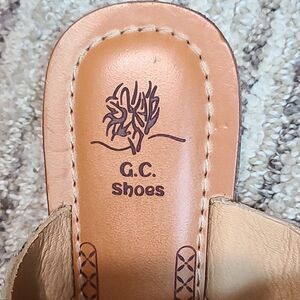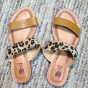 G.C. Shoes - Slip-on Sandals with Tan Strap/Leopard Strap, 1" Heel, Size 6 Shoes