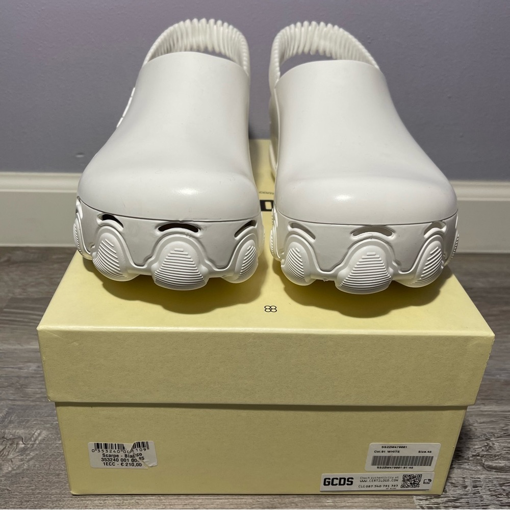 GCDS Ibex rubber clogs with non-adjustable curled effect band. Chunky sole and GCDS logo on the outsole. NIB