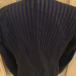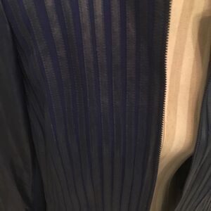 Lafayette Blue Leather Jacket with Textured Leather strips alternating with fabric at flattering angle. New with tags. $598 new plus tax reflected in price estimate below. Feel free to make reasonable offer. This is a jewel of a piece.