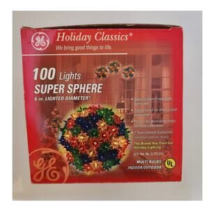 Add some vintage charm to your Christmas decor with this 2003 GE Holiday Classics 100 Christmas Lights 6" Multi-Color Super Sphere. This round lighted ball is designed with a sphere/circle shape and features a multicolor light color that will create a warm and cozy atmosphere in any room. The corded electric power source and plug control style make it easy to install and use, while the 3 A amperage ensures that your lights will brighten up any space.