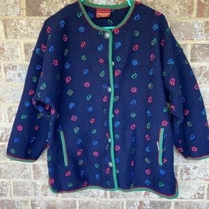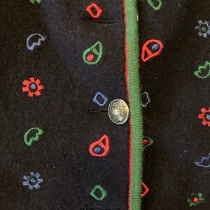 Geiger collections wool print cardigan sweater size EU38. Armpit to armpit Measures 22”. Shoulder to hemline measures 26”. Buttons down front. Pure new wool. Made in Austria. When put over a lamp there are areas that the light comes through see pictures. Not noticeable when wearing.