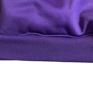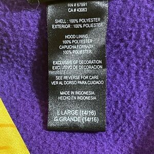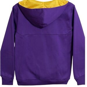Stylish purple hoodie with yellow accents and LSU logo. Perfect for fans! Good condition! Made from 100% polyester. Hoodie has two front pockets, 1/4 front zip and ribbed waist and cuffs. Length measures 24 inches. Armpit to armpit measures 19 inches. Sleeve length measures 22 inches.