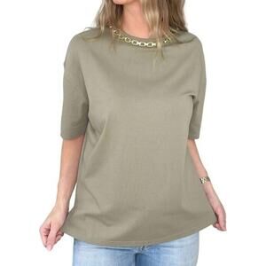 Slip into the relaxed elegance of the Generation Love Jerry Gold Chain Embellished Green Sage Tee, an essential for any wardrobe seeking a touch of effortless sophistication. With its versatile green hue and simple yet chic round neck design, this t-shirt is a perfect match for your casual outings or laid-back weekends. Tailored from soft, breathable cotton jersey, it promises all-day comfort and ease. The tee features a unique chain accent that adds a subtle edge to the oversized, collarless style, making it an ideal choice for year-round wear. Short casual sleeves ensure a comfortable fit, while the machine-washable fabric allows for easy care. Whether you're dressing for spring's mild breezes or winter's crisp air, this t-shirt is designed to be a go-to piece for every season.