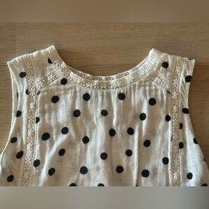 Generation Love women’s white blouse with black polkadots. Lace trim, flyaway back.