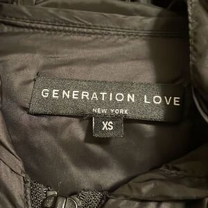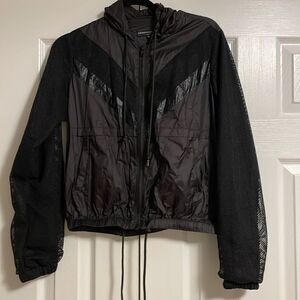 Generation Love Women’s Black Hooded Mesh Zipper Jacket. Front zipper pockets. Mesh arms and trim. Hooded. Made of nylon & polyester. Size XS.