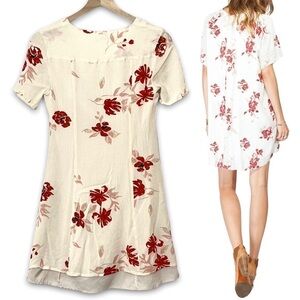 Cream short sleeve button front skater mini dress with red floral print detail. Breezy crinkle chiffon. Deep v-neckline. Princess seam detailing. Lin. Short sleeves. Exposed slip. Size extra small. Approximate measurements: 33” bust, 28” waist, 32” hips, 30.5” length.