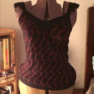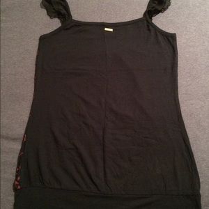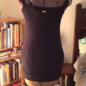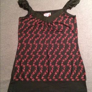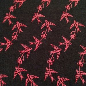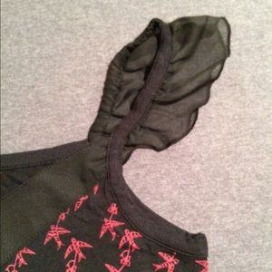 Black with red bird pattern. Hangs low. Chiffon flowy straps. Never worn.