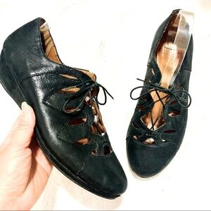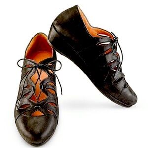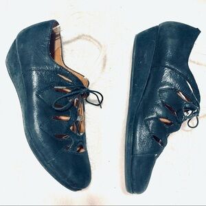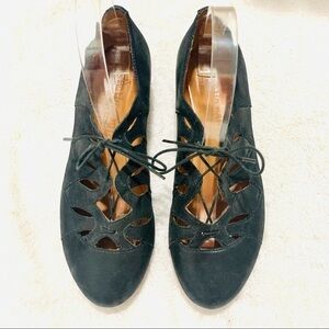 Open teardrop shapes are accented by the winding laces of Gentle Souls' nubuck ghillie, given a little lift with a slight, flexible wedge.