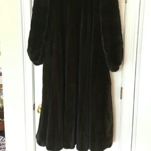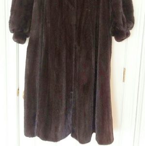 Genuine natural black ranch mink by Revillon. Features small shawl collar, bracelet cuffs & 3 hook and eye closures. The pelts are sewn into beautiful soft flowing design adding grace and elegance. There are no leather strips between pelts. The coat has black satin-like lining & 2 lined pockets. Size M-L. Length collar seam to hem-51 inches. Rarely worn. Excellent condition.
