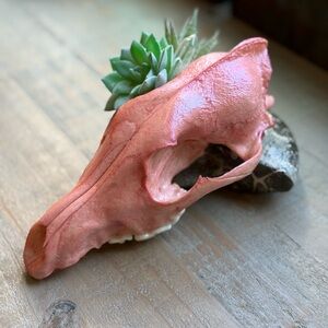 Hand painted pink coyote top skull with faux succulents and quartz crystals. Ethically sourced coyote. Wire attached to the back so you can hang it on the wall!