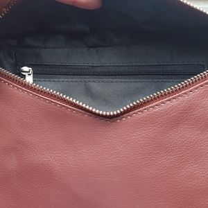 Lovely and excellent condition! Has a zipper pocket inside amd on the back. Appears to be unused other than the small spot shown in picture 5 (this is the bottom left corner of the back of the purse - barely noticeable at all). Last 2 pics are best representation of color! It is 11" wide amd 7" tall.
